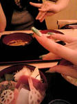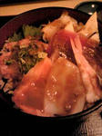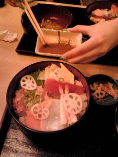二人揃って海鮮丼。いつもピースじゃつまらない、と、何故か手を狐さんにする